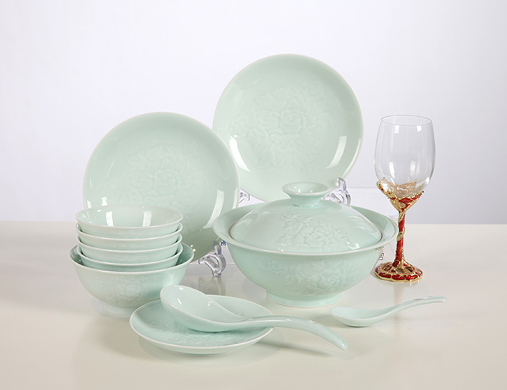 32頭影青雕刻餐具--牡丹花