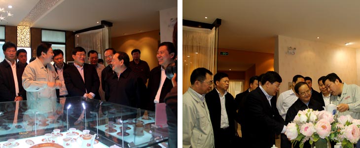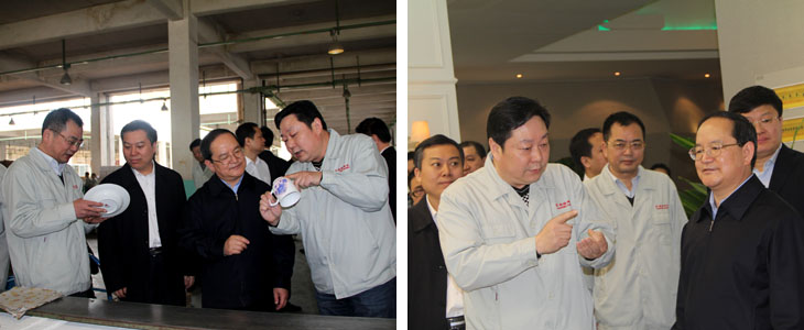 2012年4月6日江西省人民政府省長鹿心社一行在市委書記鄧保生、市長劉昌林等省市領導的陪同下來我司視察工作,鹿心社省長一行參觀了工廠生產(chǎn)車間、國瓷館,詳細了解了公司的生產(chǎn)運營情 況并對公司產(chǎn)品贊不絕口。視察期間,鹿心社省長對公司給予了高度評價:“你們公司為景德鎮(zhèn)爭了光,為江西爭了光,為國家爭了光。"并希望公司能牢牢抓住精品路線,抓住高端市場,搞活機制,繼續(xù)做的更大更好。