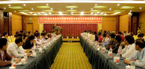 10月18日下午,由瓷博會、省陶瓷公司主辦的“2012年中國景德鎮(zhèn)國際陶瓷博覽會采購商與參展企業(yè)對接會”在開門子三樓會議室舉行。來自10余個國家的40家采購商以及由瓷博會根據(jù)采購需求挑選出來的55家參展商參加了此次對接會議。副市長張春萍出席會議并致辭。