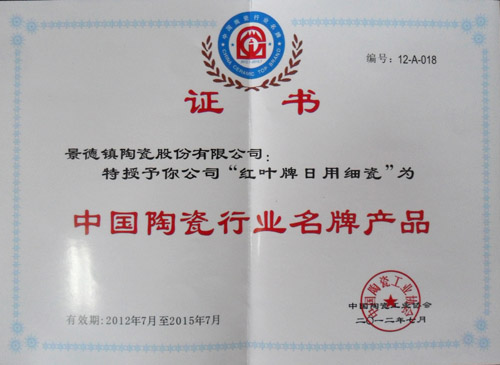 中國(guó)陶瓷工業(yè)協(xié)會(huì)于今年2月份開展了第五批中國(guó)陶瓷行業(yè)名牌產(chǎn)品的推薦評(píng)審及復(fù)評(píng)工作。經(jīng)過(guò)企業(yè)自愿申請(qǐng)、資料審查、專家評(píng)審、組委會(huì)領(lǐng)導(dǎo)小組審查、公示等一系列細(xì)致的工作,最終評(píng)選出了2012年“中國(guó)陶瓷行業(yè)名牌產(chǎn)品”。公司生產(chǎn)的“紅葉”牌日用陶瓷再次被評(píng)為“中國(guó)陶瓷行業(yè)名牌產(chǎn)品”。